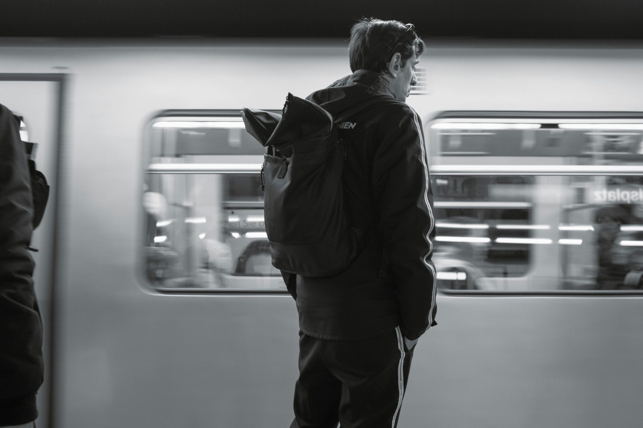 Person waiting by a moving train in black and white